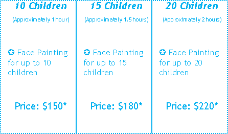 Face Painting Parties Prices & Packages… µ Costumed Face Painter µ We can do many different face designs, from the classic Spider Man and Butterflies, to Monsters and Swan Princesses.